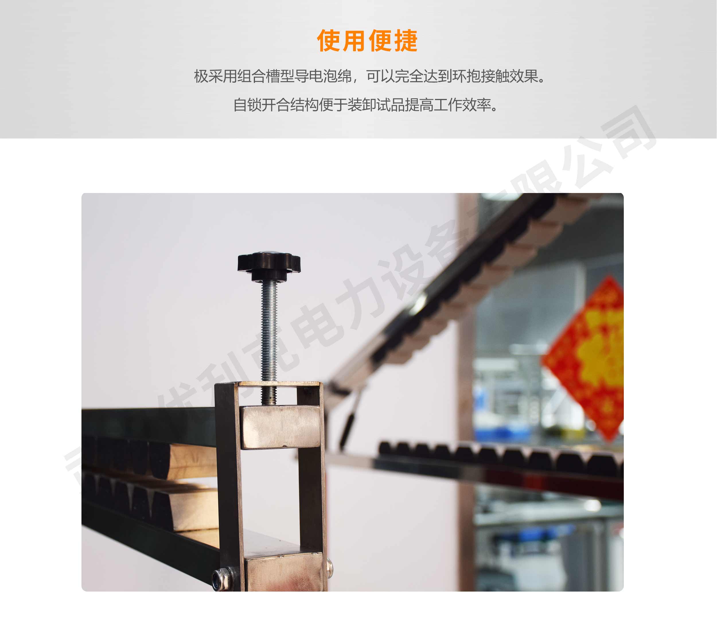 3、極采用組合槽型導電泡綿,可以完全達到環抱接觸效果。自鎖開合結構便于裝卸試品提高工作效率。