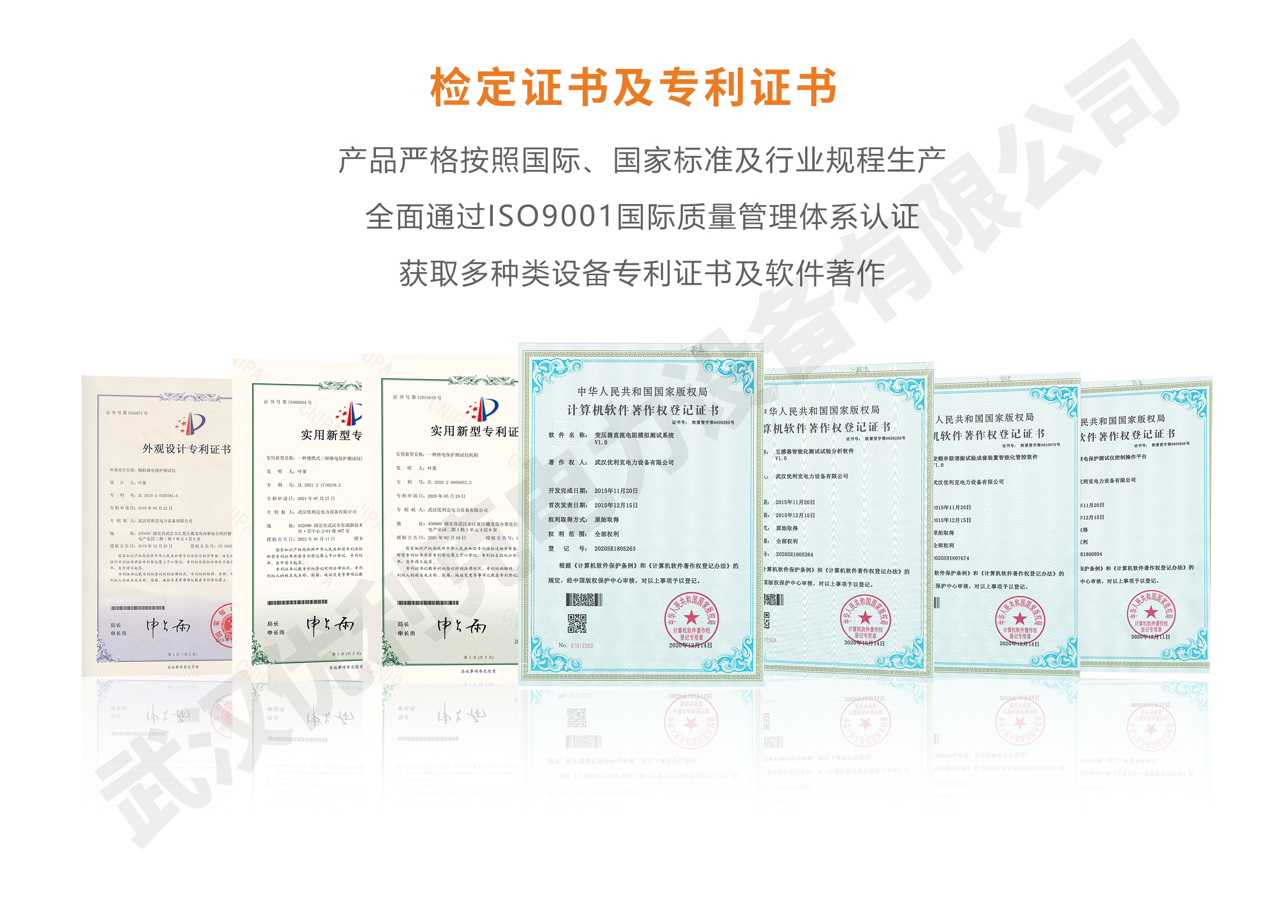 企業產品嚴格按照國際、國家標準及行業規程生產,通過國家、各省級、市級電力研究所、計量中心及電力權威部門的檢測,全面通過ISO9001國際質量管理體系認證、中華人民共和國制造計量器具許可證、GB/T19001-2016質量管理體系要求、GB/T24001-2016環境管理體系要求、GB/T45001-2020職業健康安全管理體系要求。