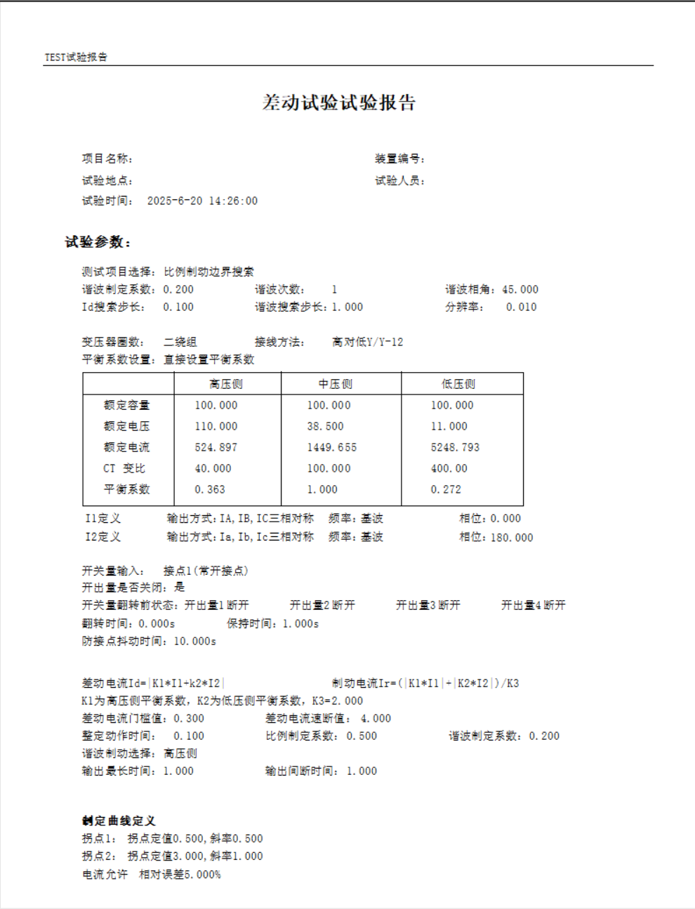 試儀型號、被測試差動保護(hù)裝置型號等)、試驗步驟、試驗結(jié)果、結(jié)果分析以及結(jié)論等內(nèi)容。在結(jié)論部分,應(yīng)對保護(hù)裝置的差動保護(hù)